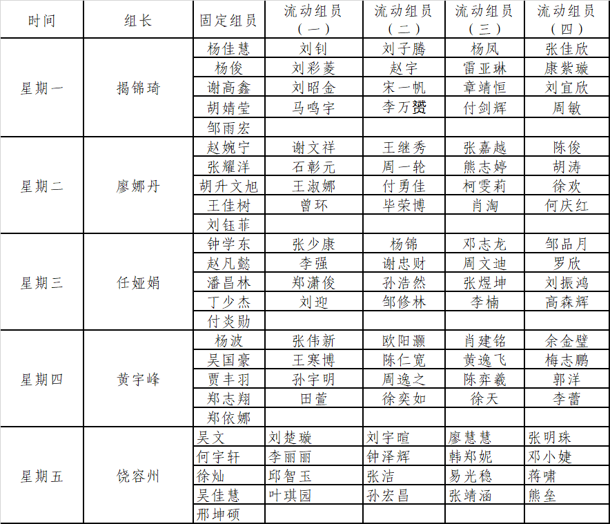 每组设立组长一名,负责统筹协调小组工作,定期向老师汇报工作进展。小组成员分成五个小组,每天安排一组进行监督工作,每组负责一天的课堂纪律监督任务。每个小组内部再进行具体分工。一个小组(组长+组员)共十人,四周一个周期循环。现将永久91嫩草亚洲精品人人2024年秋季学期课堂纪律监督小组名单及安排公布如下。