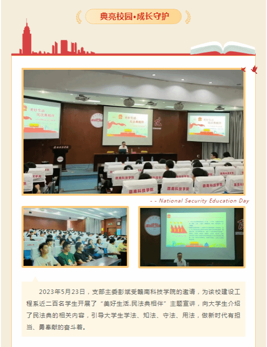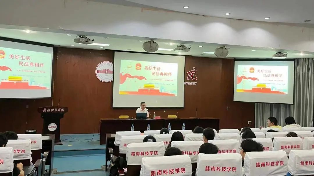 2023年5月23日,支部主委彭斌受赣南科技学院的邀请,为该校建设工程系近二百名学生开展了“美好生活.民法典相伴”主题宣讲,向大学生介绍了民法典的相关内容,引导大学生学法、知法、守法、用法,做新时代有担当、勇奉献的奋斗着。