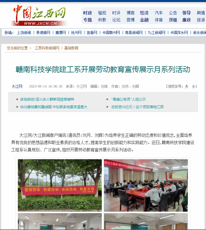 大江网/大江新闻客户端讯5月14日电:为培养学生正确的劳动态度和价值观念,全面培养具有优良的思想品德和职业素质的合格人才,提高学生的创新能力和实践能力。近日,赣南科技学院建设工程系认真规划、广泛宣传,组织开展劳动教育宣传展示月系列活动。