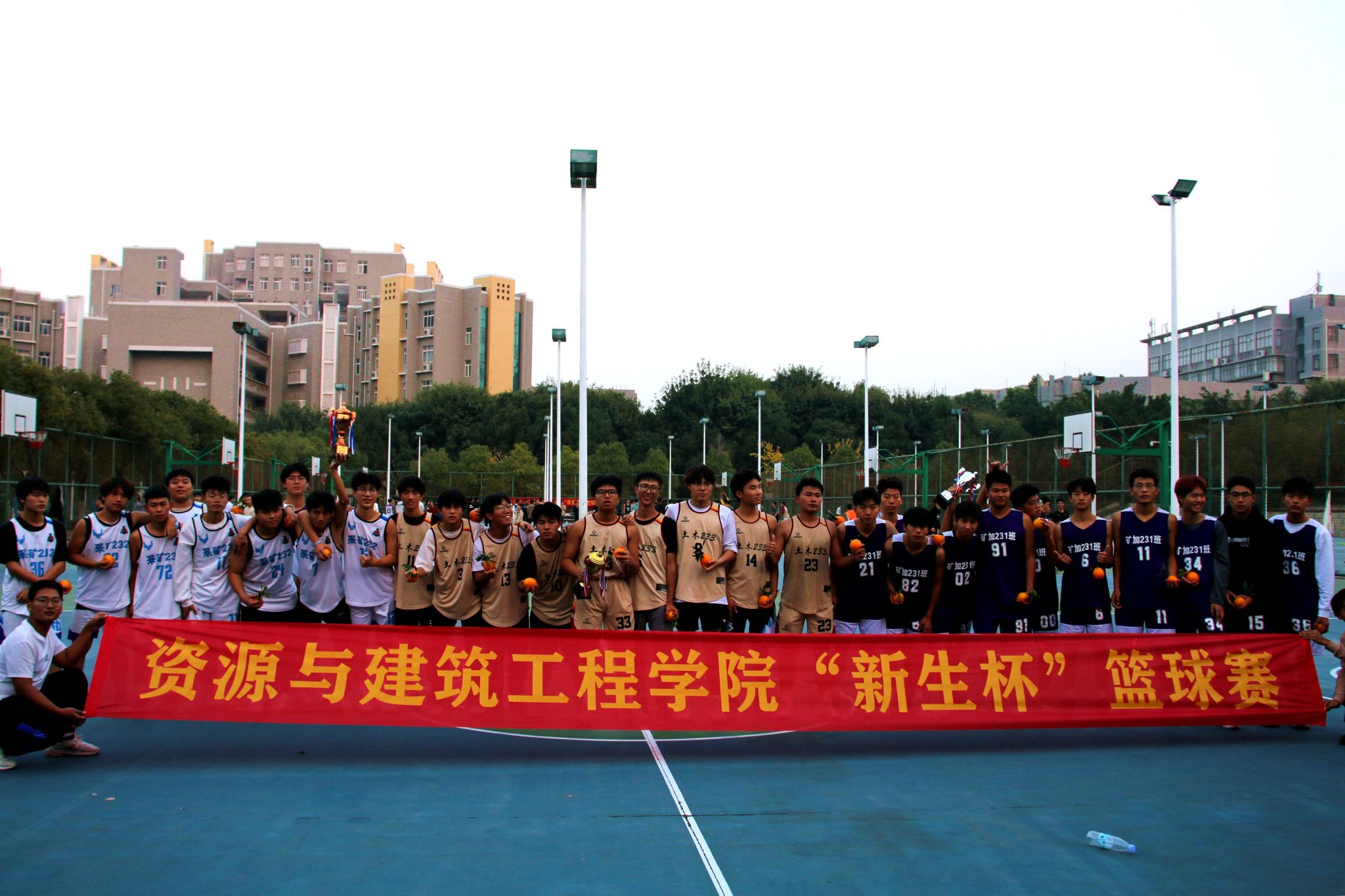 此次比赛将12个参赛班级分成四小组,组内以积分形式决出入围八强班级。经过淘汰赛、小组赛的层层选拔,土木233班与矿加231班脱颖而出,会师决赛。比赛期间,各班级拉拉队们在场下为球员们加油呐喊,场上球员你争我夺,充分发挥团队精神,紧密配合。最终,土木233班以20分的领先优势夺得此次“新生杯”冠军。