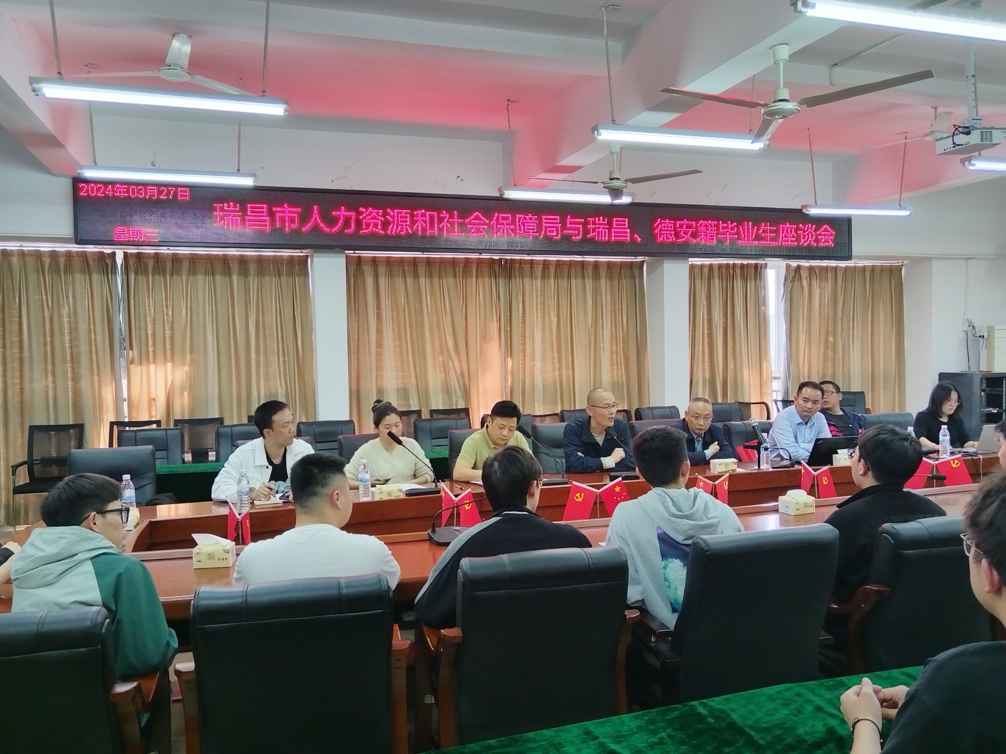 本网讯:为切实积极深入贯彻落实人才强国战略,促进大学生就业的决策部署,3月27日下午,瑞昌市人力资源和社会保障局王建国一行带领江西亚东水泥有限公司、江西瑞德电子有限公司、浙江凯耀照明有限责任公司三家企业来资土学院开展校企交流与合作活动,并在崇善楼Z713与学院瑞昌、德安籍毕业生开展座谈会。涂黎明主持本次会议。