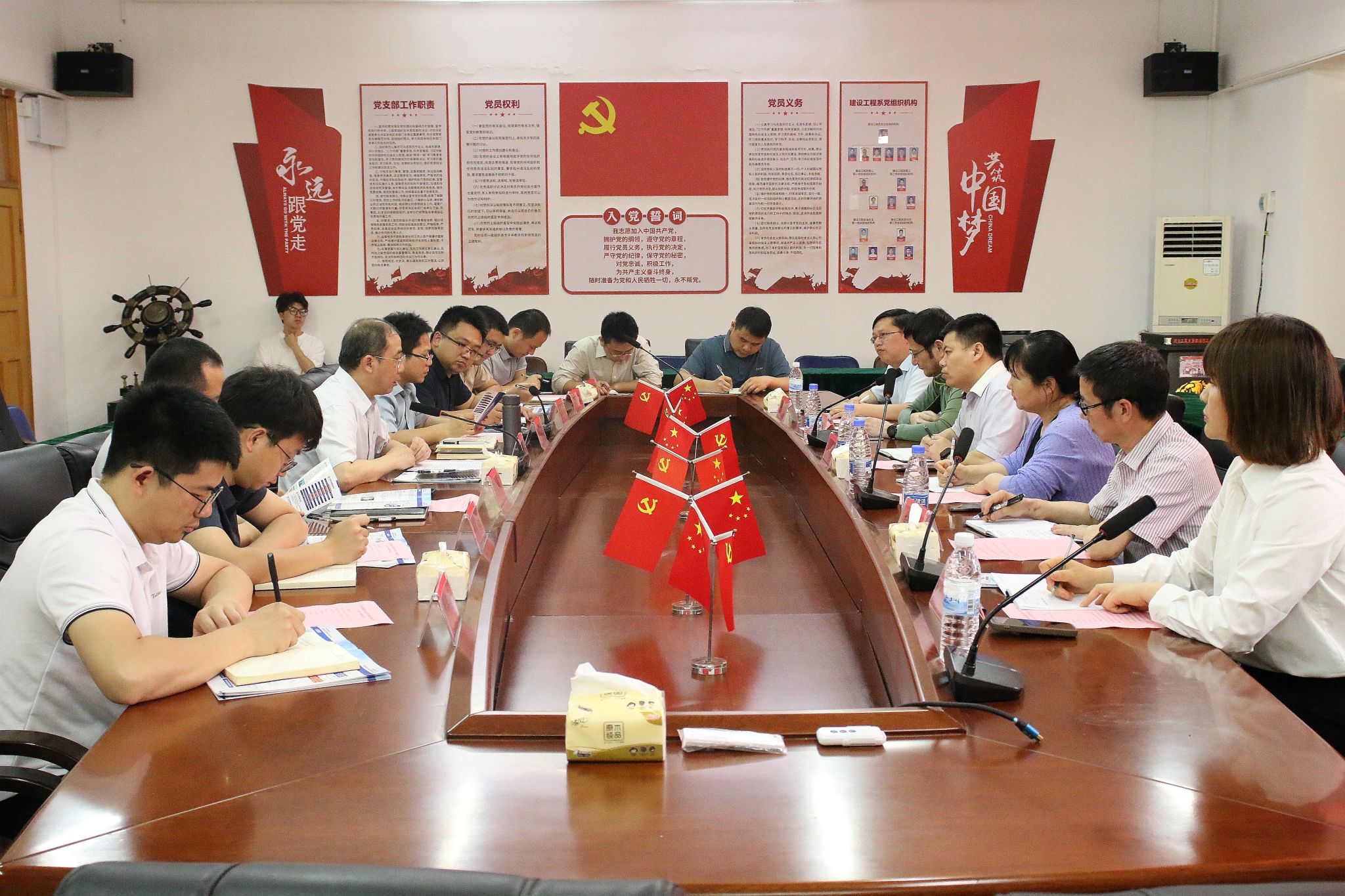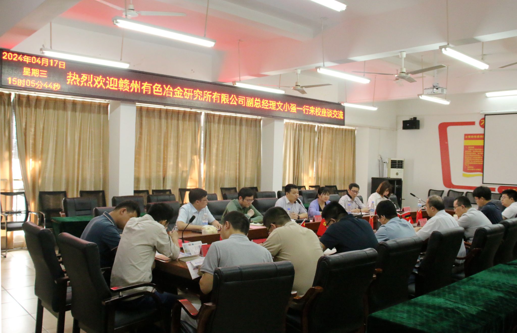 本网讯:4月17日下午,赣州有色冶金研究所有限公司副总经理文小强一行来到永久91嫩草亚洲精品人人洽谈交流。资土学院党委书记刘俊峰于崇善楼Z713接待文小强一行,卢志刚等人参加洽谈会。