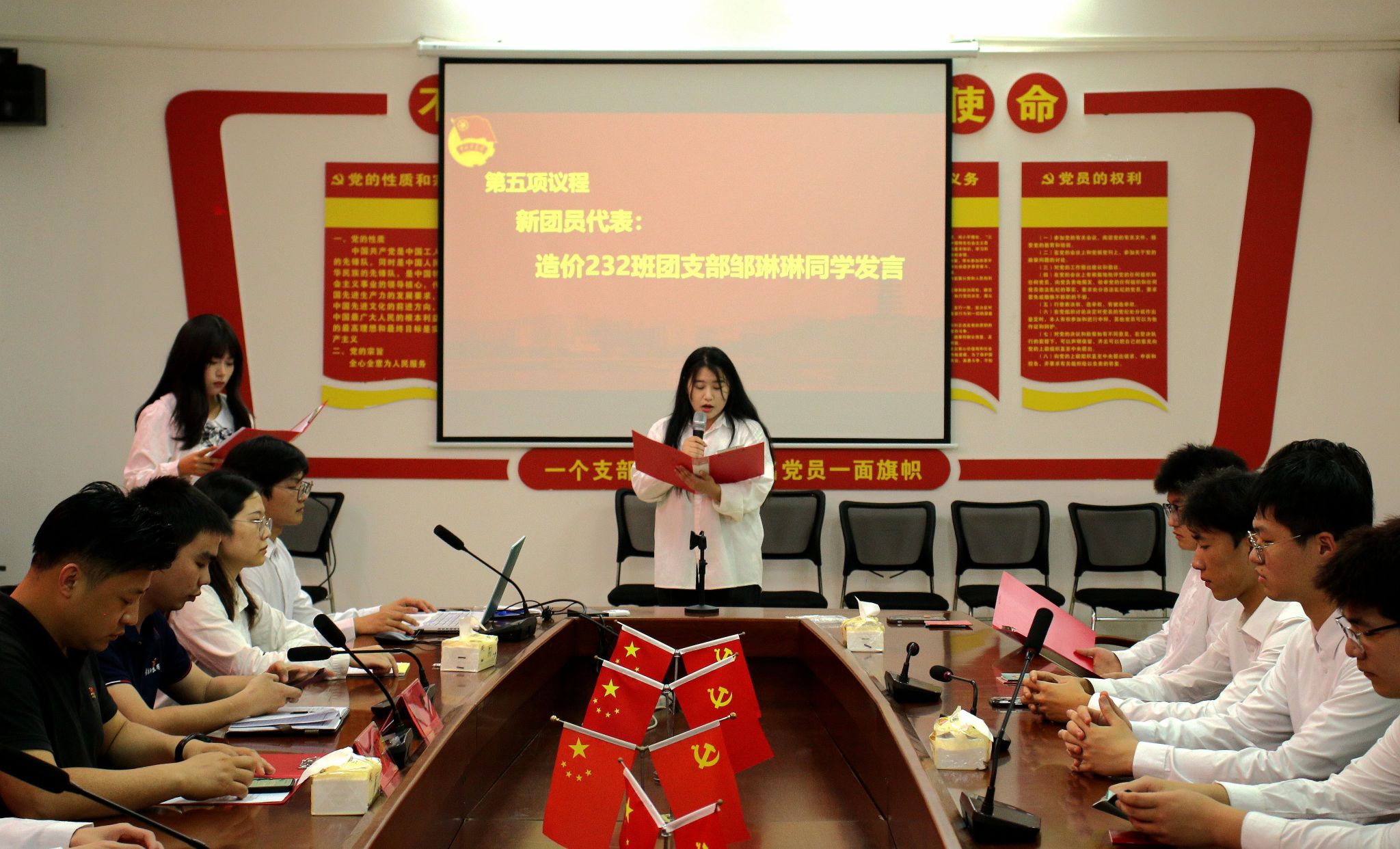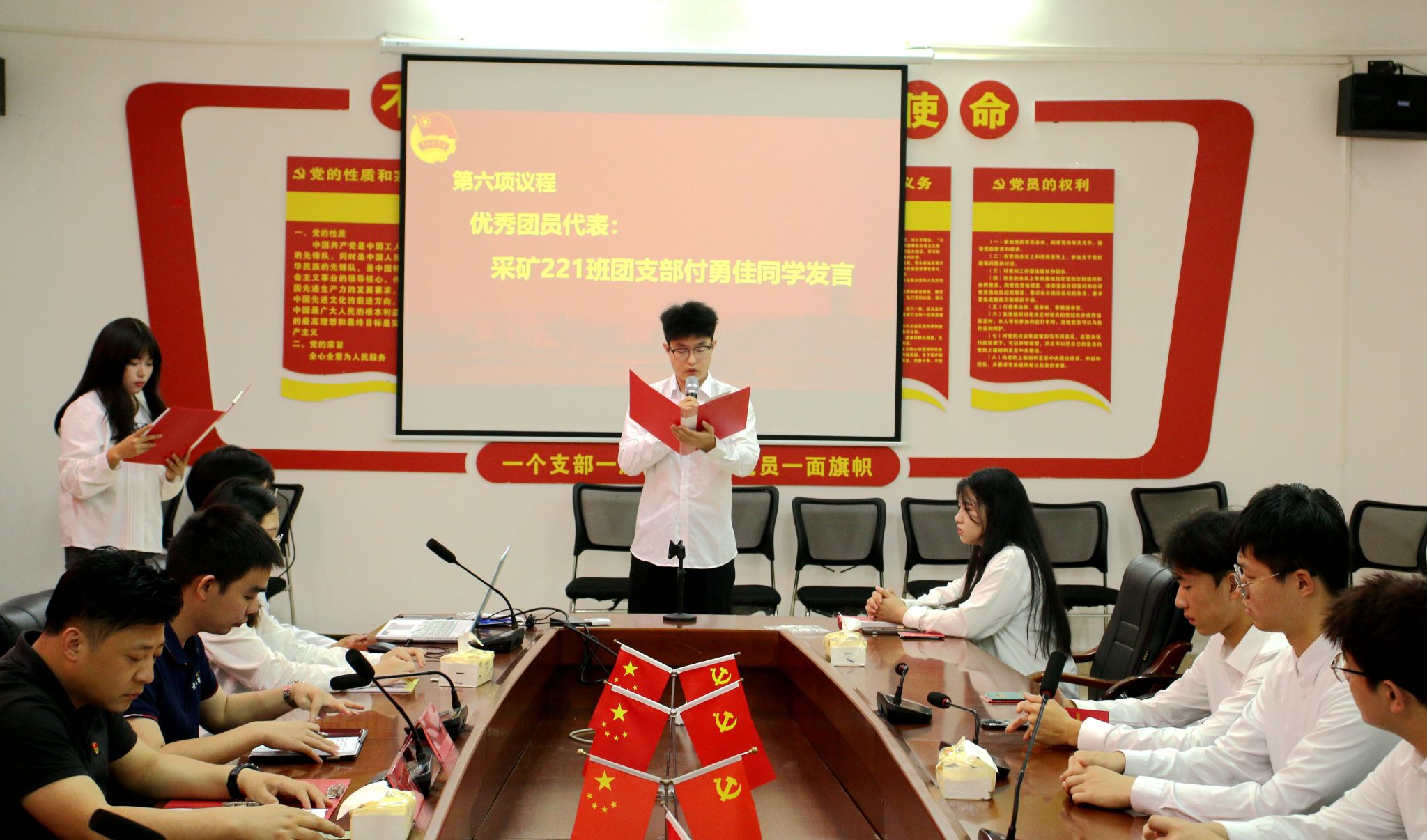 随后,新团员代表邹琳琳同学在会上发言,表示要成为一名有理想,有抱负,与时俱进的团员。紧接着,优秀团员代表付勇佳同学发言,他说要以团员的标准要求自己,牢记自己是一名光荣的共青团员,让团徽在胸前永远闪光。