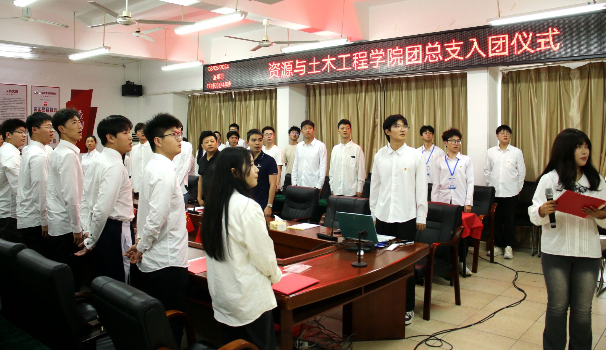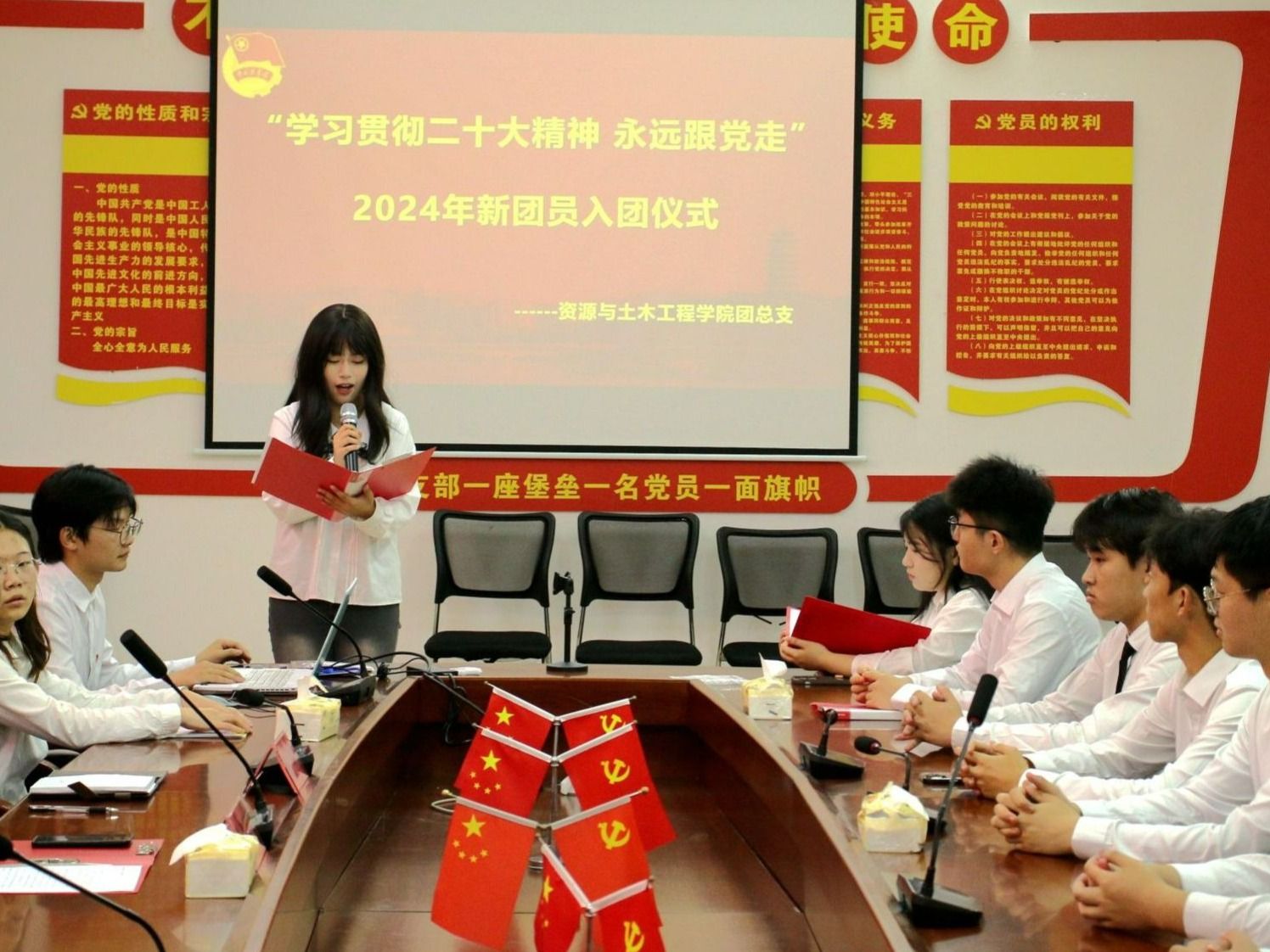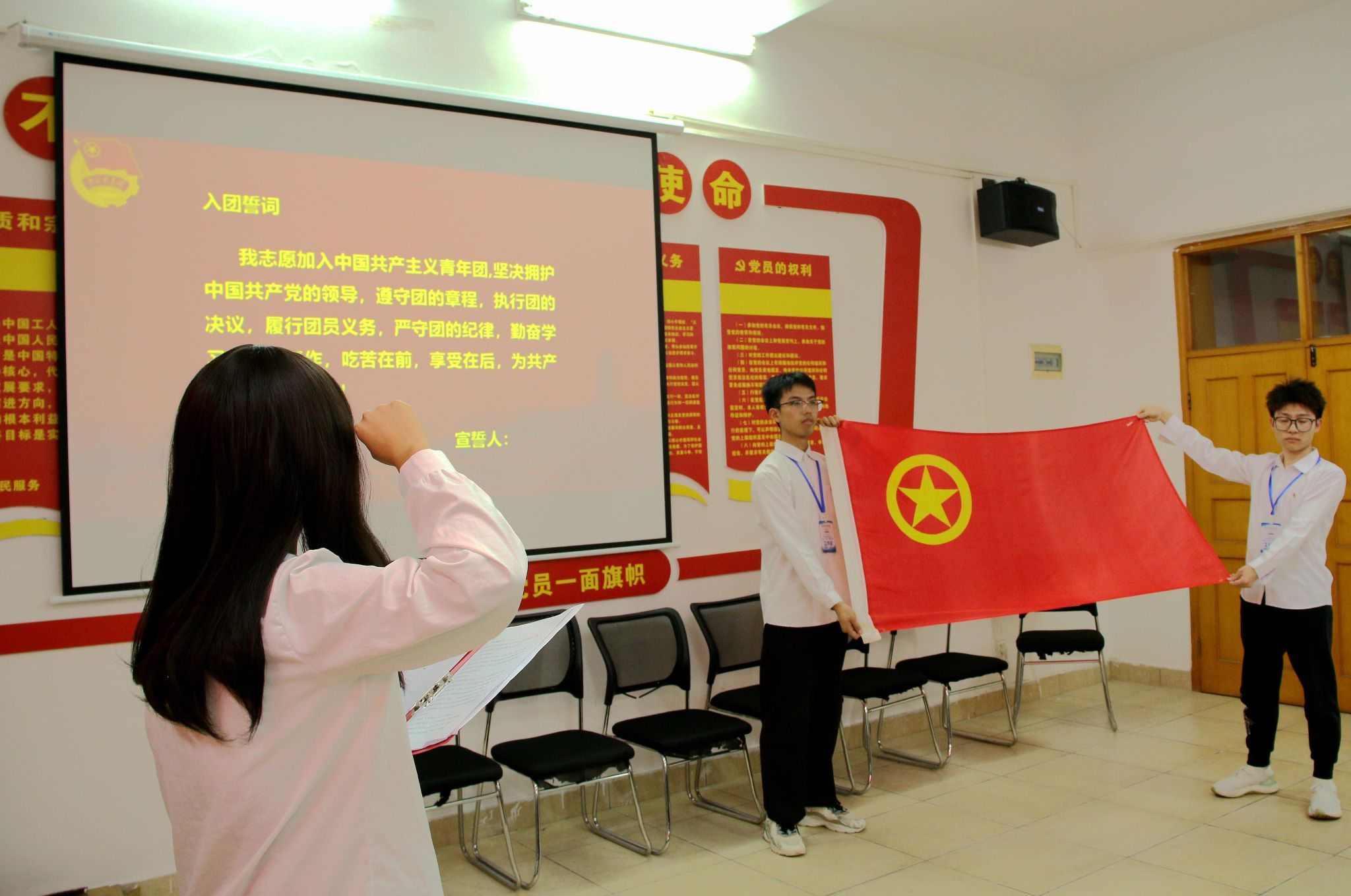 大会伊始,全体人员保持肃穆,奏唱国歌;主持人宣读新团员名单,资土学院学工负责人涂黎明和团总支负责人刘辉为新团员颁发团徽、团员证和团章,并在刘辉老师的带领下庄严宣誓,正式加入中国共产主义青年团。