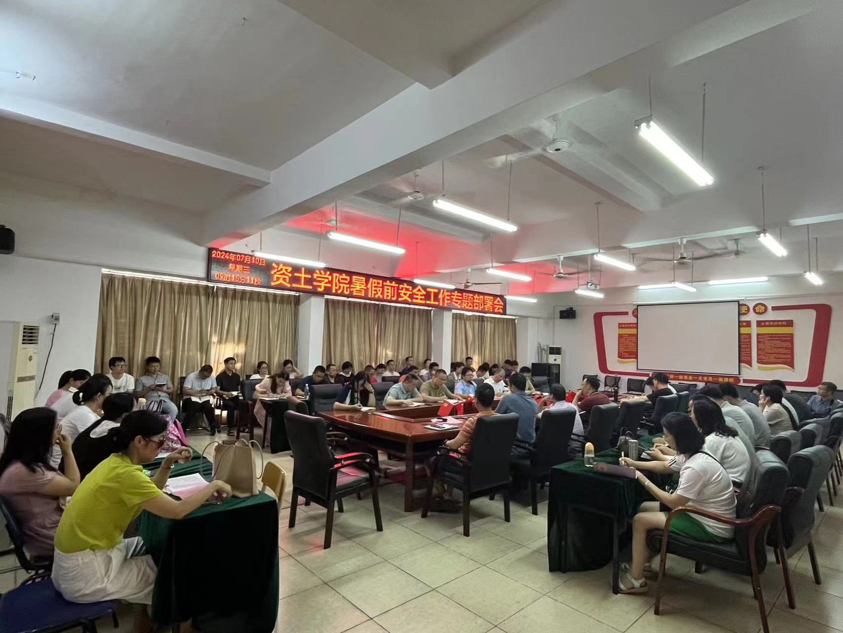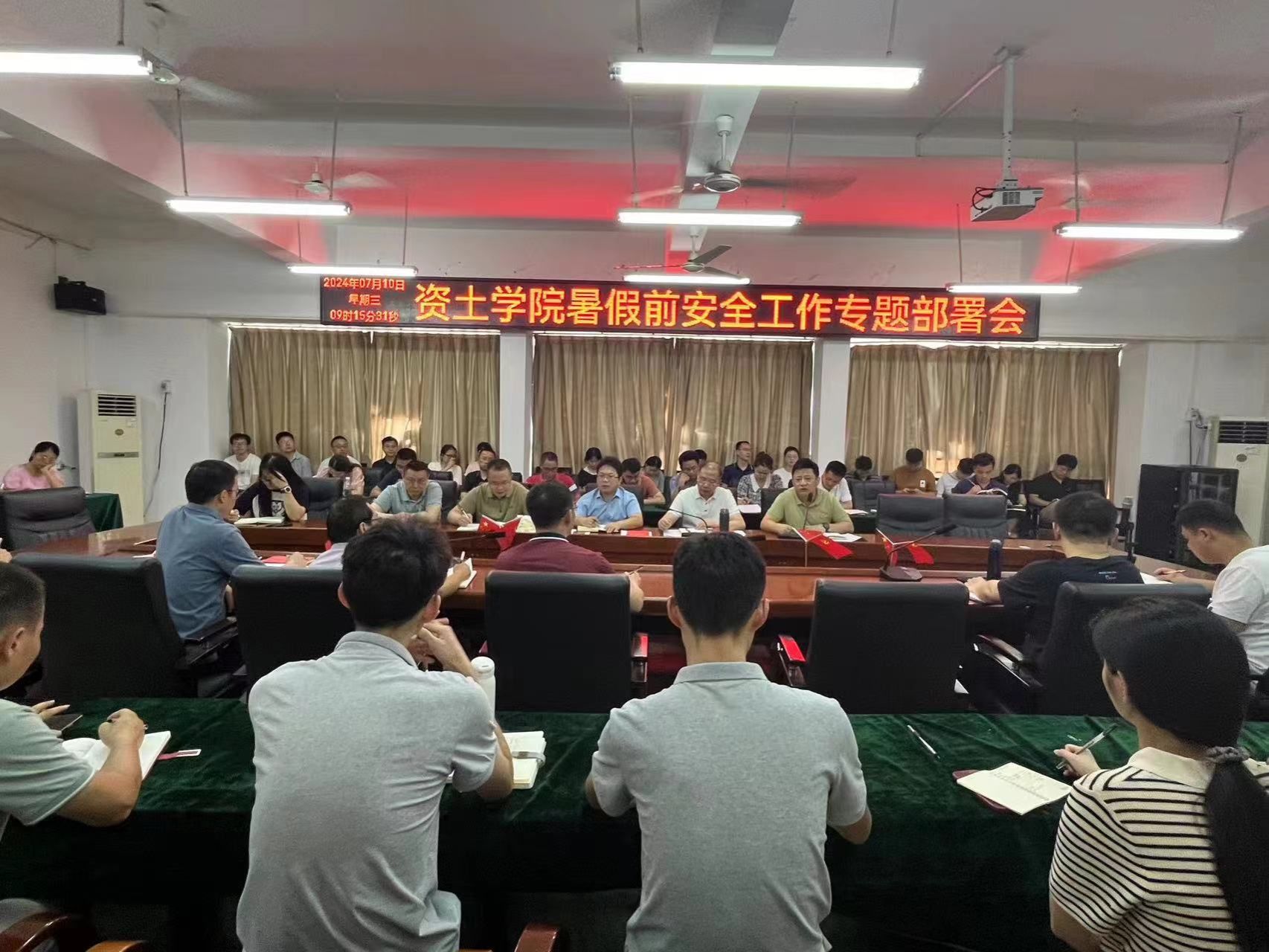 资土学院学工负责人涂黎明部署学生暑期安全工作,他表示,各位班主任和辅导员要加强对学生的暑期安全教育,一是要做好学生暑期安全离校工作,加强家校合作,班主任辅导员要及时与家长联系,做好暑期往返安全和日常安全提醒,特别是针对暑期易发的溺水、交通事故等问题以及网络安全、心理健康安全、食品安全和用电安全等进行提醒,防止意外事故的发生,各班级要对宿舍开展一次全面的安全大检查,及时发现并处理安全隐患;二是做好学生暑期留校安全工作,及时召开安全会议,做好暑期日常管理,要严格落实安全责任制度,确保师生安全;三是做好法制教育普及,教育引导学生自觉遵守法律法规和校规校纪。