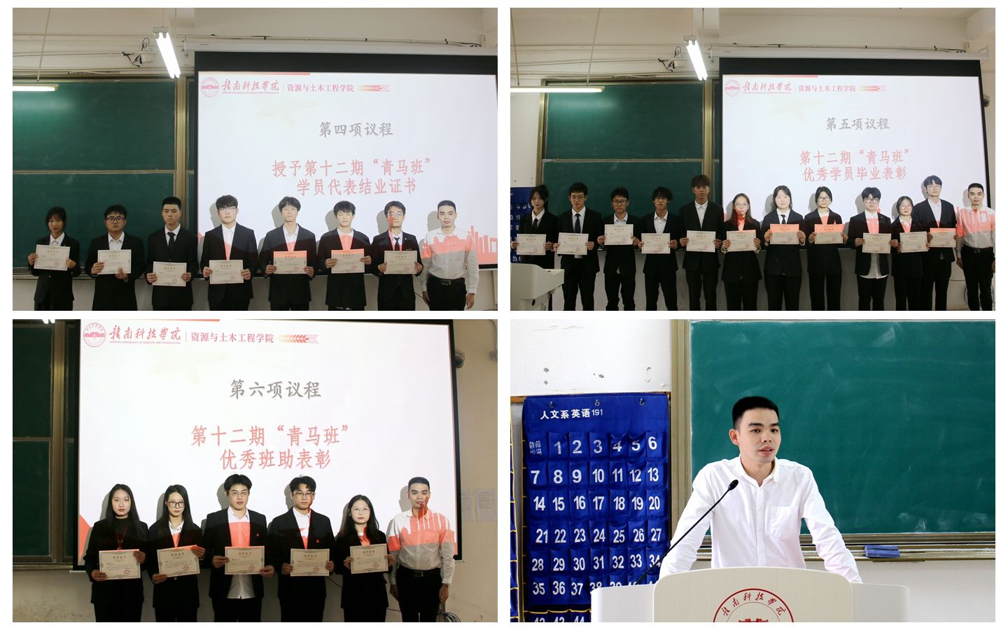 刘辉老师为第十二期青马班学员代表授予结业证书并进行优秀学员表彰。会议尾声,刘辉老师对本次仪式进行总结,肯定第十二期青马班学员的优秀成绩,并对新成员提出要求,希望第十三期青马班学员向优秀学员学习,在接下来青马班学习中,以习近平新时代中国特色社会主义思想为指导,着眼党的事业薪火相传,增进对党的政治认同、思想认同、理论认同、情感认同,通过思想淬炼、政治历练、实践锻炼,成长为理想远大、信念坚定、素质全面、作风优良的青年马克思主义者。最后,仪式在青马班班助揭锦琦同学带领全体青马学员集体宣誓中圆满结束。