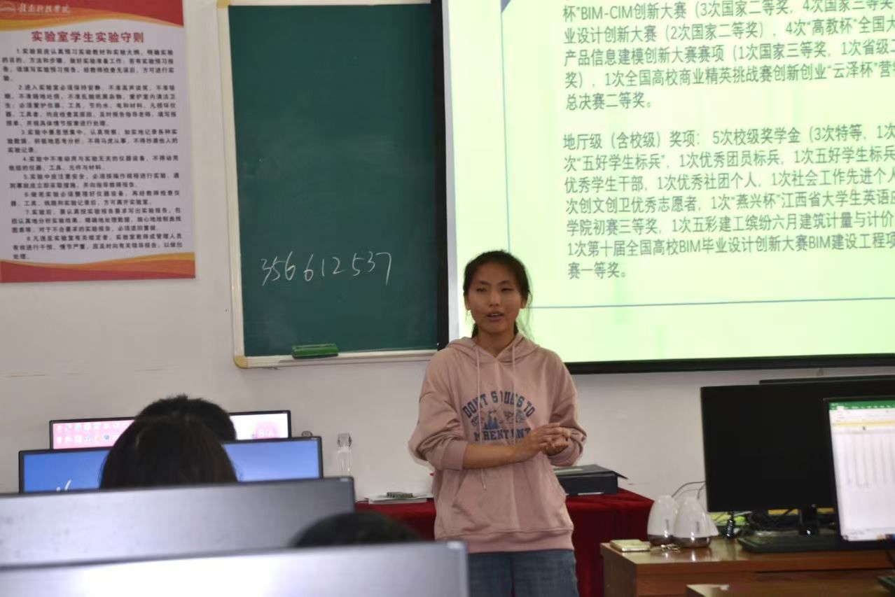 主讲人蒋荟兰讲解全国数字建筑创新应用大赛、BIM毕业设计创新大赛、全国大学生先进成图大赛等专业相关比赛,并向同学们阐述参加专业相关比赛不仅可以充实大学生活,还有助于争取奖学金和个人荣誉,提升专业技能水平,为日后的职场工作积累宝贵经验。活动过程中,建筑信息协会请到造价213班崔枝雪学姐来分享自己的比赛经历,为学生们树立榜样,指明方向,并向学生们说明比赛为个人带来的价值。