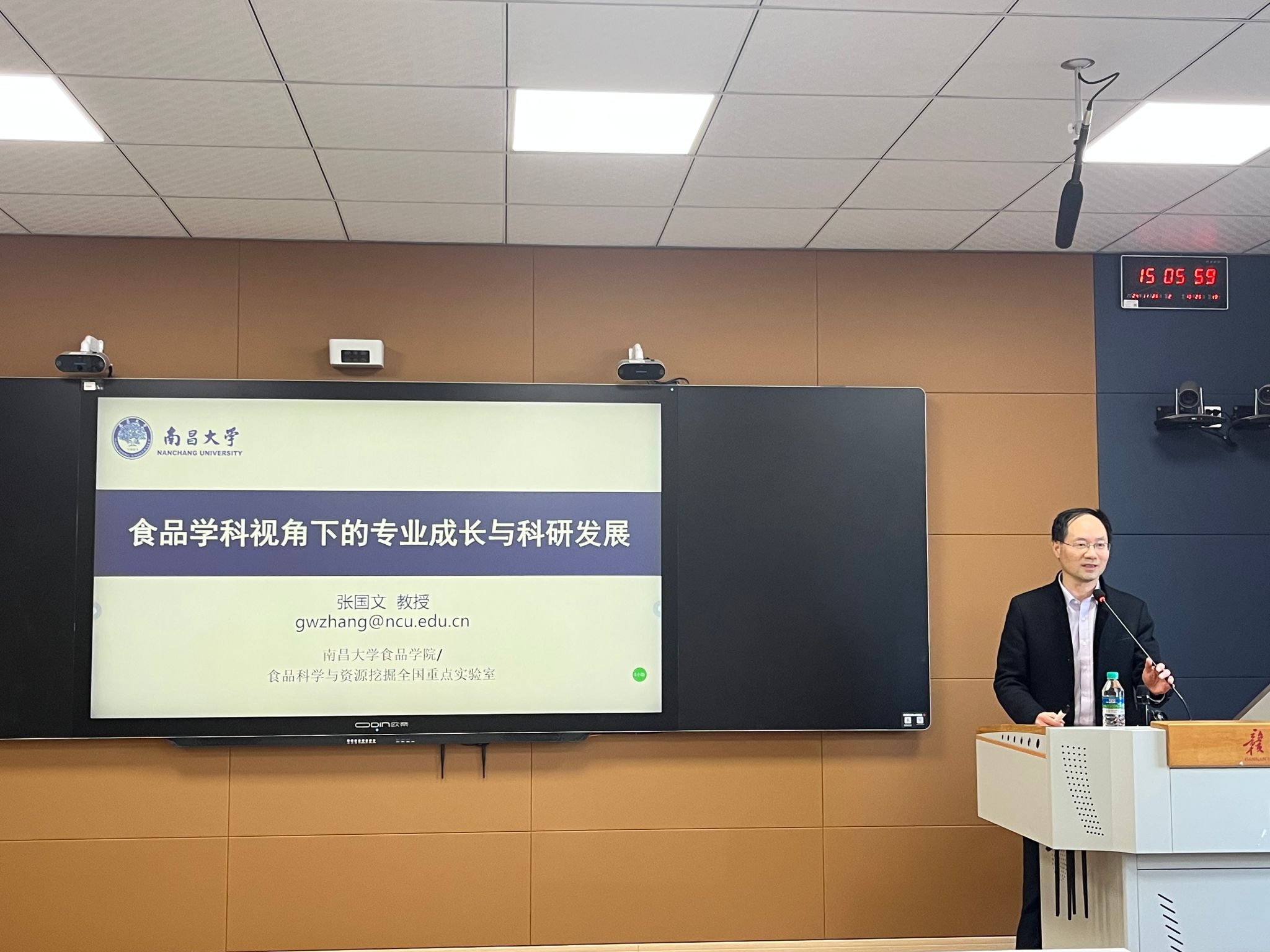 张国文教授就食品工业的现状与未来发展、食品学科学生的专业成长之路以及新进教师科研之路三个方面为大家进行了精彩的授课,赢得了现场师生的热烈掌声,老师和学生们表示意犹未尽,十分受益。