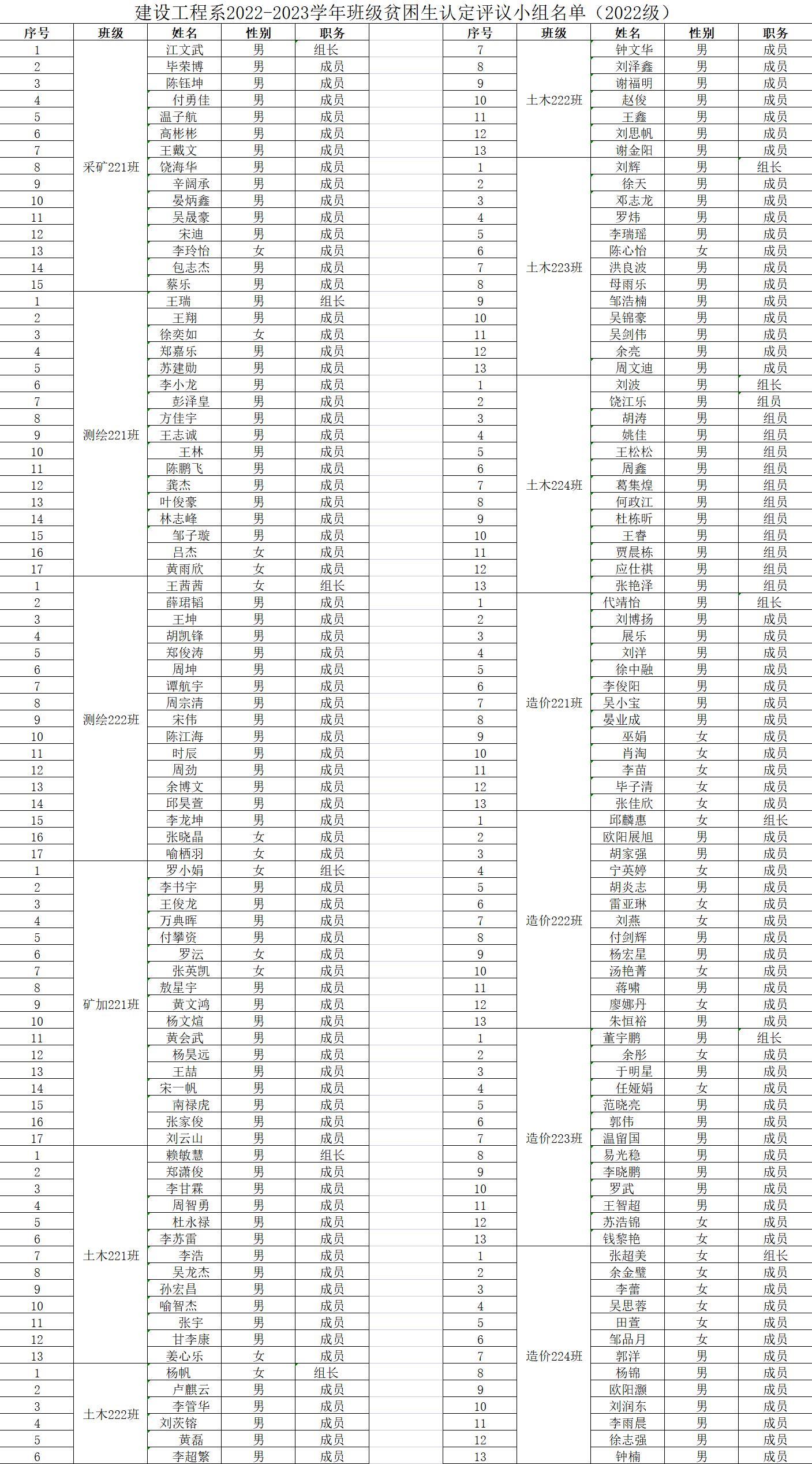 本网讯:建设工程系2022-2023学年19级—20级家庭经济困难学生认定评议小组成员名单公示: