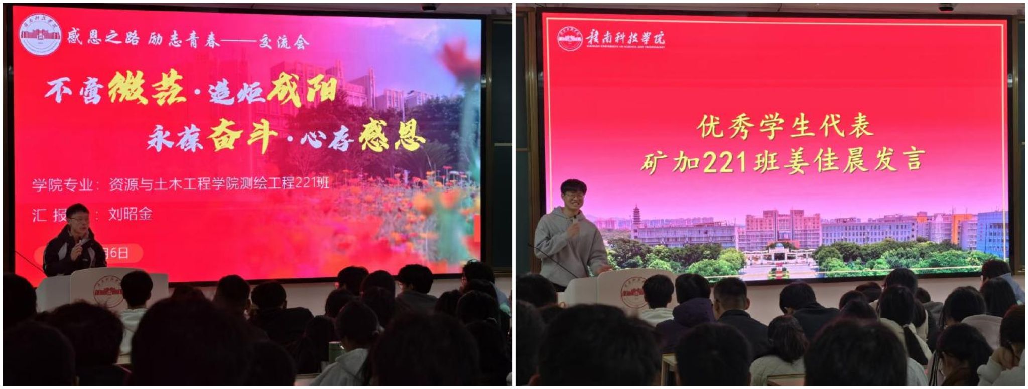 随后,由国家奖学金获得者优秀学生代表姜佳晨同学和国家励志奖学金获得者优秀学生代表刘昭金同学依次上台以亲身经历分享了他们的成长故事和励志经历。学生代表们讲述了自己在经济困难情况下,通过资助政策的帮助,克服困难,积极投身学业的经历和在社会实践中回馈社会的感悟。他们的事迹不仅展现了资助政策的惠民效果,更彰显了青年学生自强不息的精神面貌。