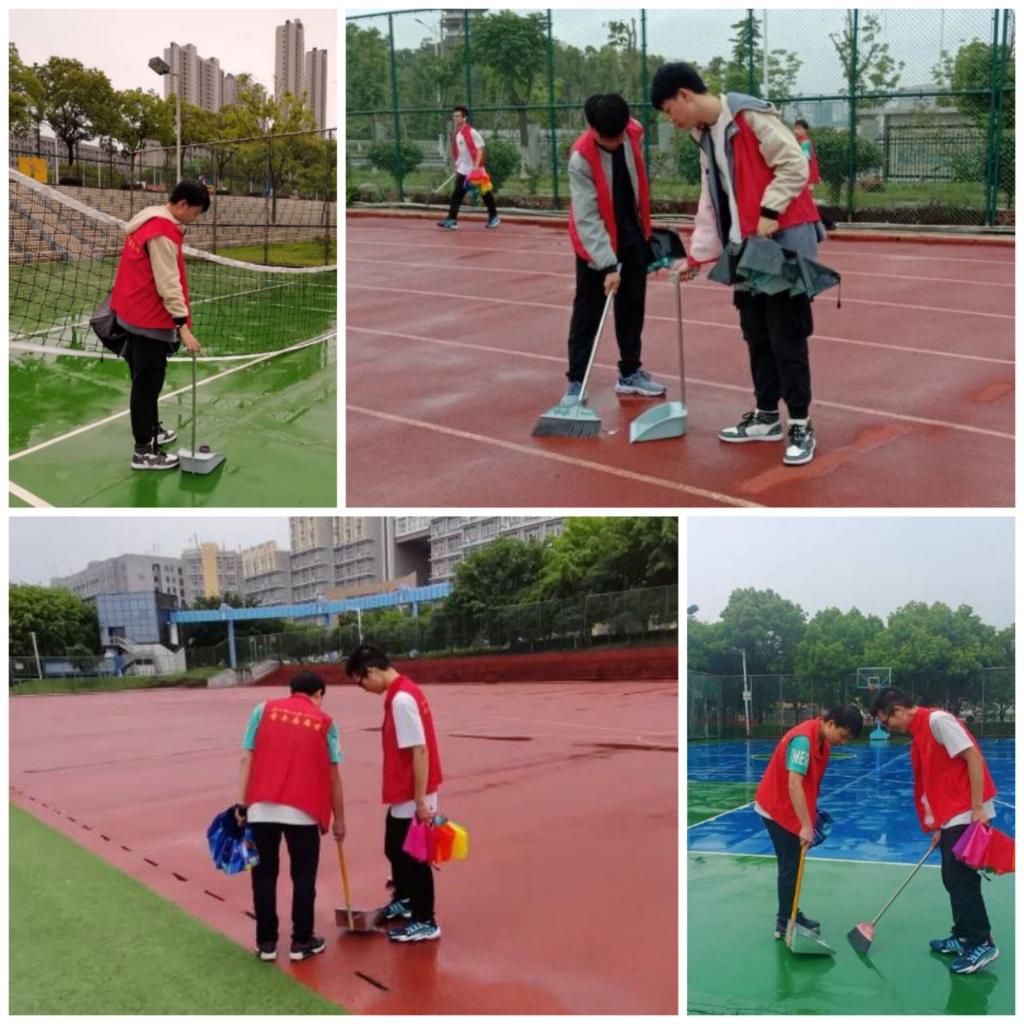本次清扫活动主要范围为篮球场、田径场周边,主要任务为清扫道路中的落叶、垃圾、乱涂乱画的污染物及角落里的烟头。在校友部成员的组织与安排下,同学们分成两队,分别打扫篮球场和田径场,虽然雨后的地面增加了清扫的难度,但在活动过程中,同学们相互配合,积极清扫,快速高效的完成了清扫任务。