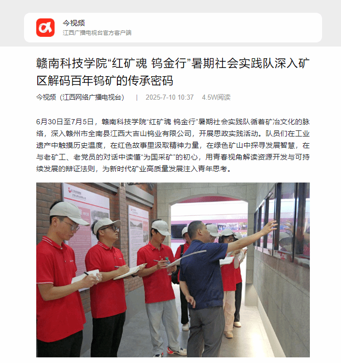 6月30日至7月5日,赣南科技学院“红矿魂 钨金行”暑期社会实践队循着矿冶文化的脉络,深入赣州市全南县江西大吉山钨业有限公司,开展思政实践活动。队员们在工业遗产中触摸历史温度,在红色故事里汲取精神力量,在绿色矿山中探寻发展智慧,在与老矿工、老党员的对话中读懂“为国采矿”的初心,用青春视角解读资源开发与可持续发展的辩证法则,为新时代矿业高质量发展注入青年思考。