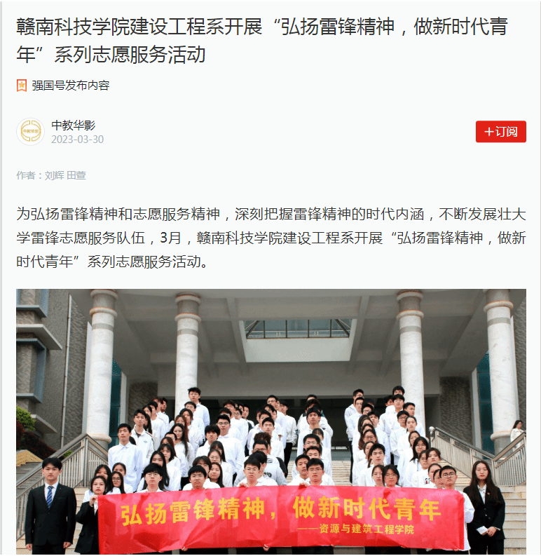学习强国中教华影3月30日电(通讯员:刘辉 田萱):为弘扬雷锋精神和志愿服务精神,深刻把握雷锋精神的时代内涵,不断发展壮大学雷锋志愿服务队伍,3月,赣南科技学院建设工程系开展“弘扬雷锋精神,做新时代青年”系列志愿服务活动。