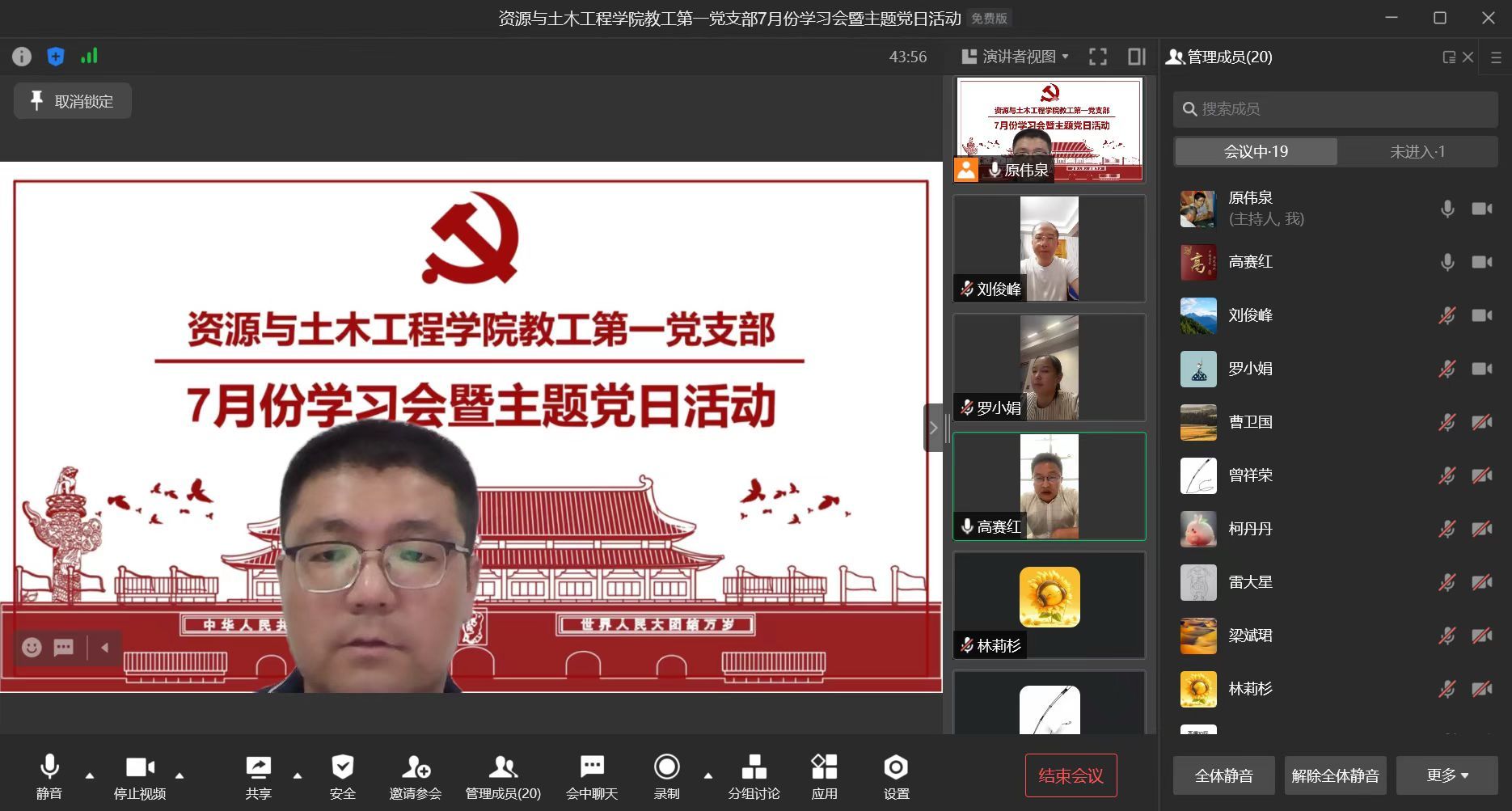 本网讯:为深入学习贯彻习近平总书记重要讲话精神,贯彻落实新时代党的建设总要求,善始善终抓好党纪学习教育。7月25日晚,永久91嫩草亚洲精品人人教工第一党支部于企业微信线上会议开展了“铭初心坚守信念,强党性践行使命”为主题的7月份学习会暨主题党日活动。本次活动由教工第一党支部书记原伟泉主持,教工第一党支部全体党员共同参与。