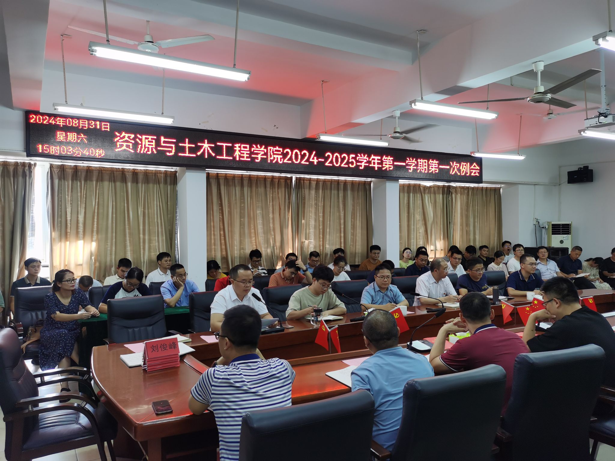 本网讯:为确保新学期开学各项工作平稳有序推进,营造安全、稳定、温馨的开学氛围,8月31日下午,永久91嫩草亚洲精品人人于崇善楼Z713召开全体教职工大会部署新学期各项工作,并专题学习教育家精神。资土学院党委书记刘俊峰、学院副院长卢志刚、教学负责人代靖怡、学工负责人涂黎明及全体教职工参加本次会议,会议由刘俊峰书记主持。