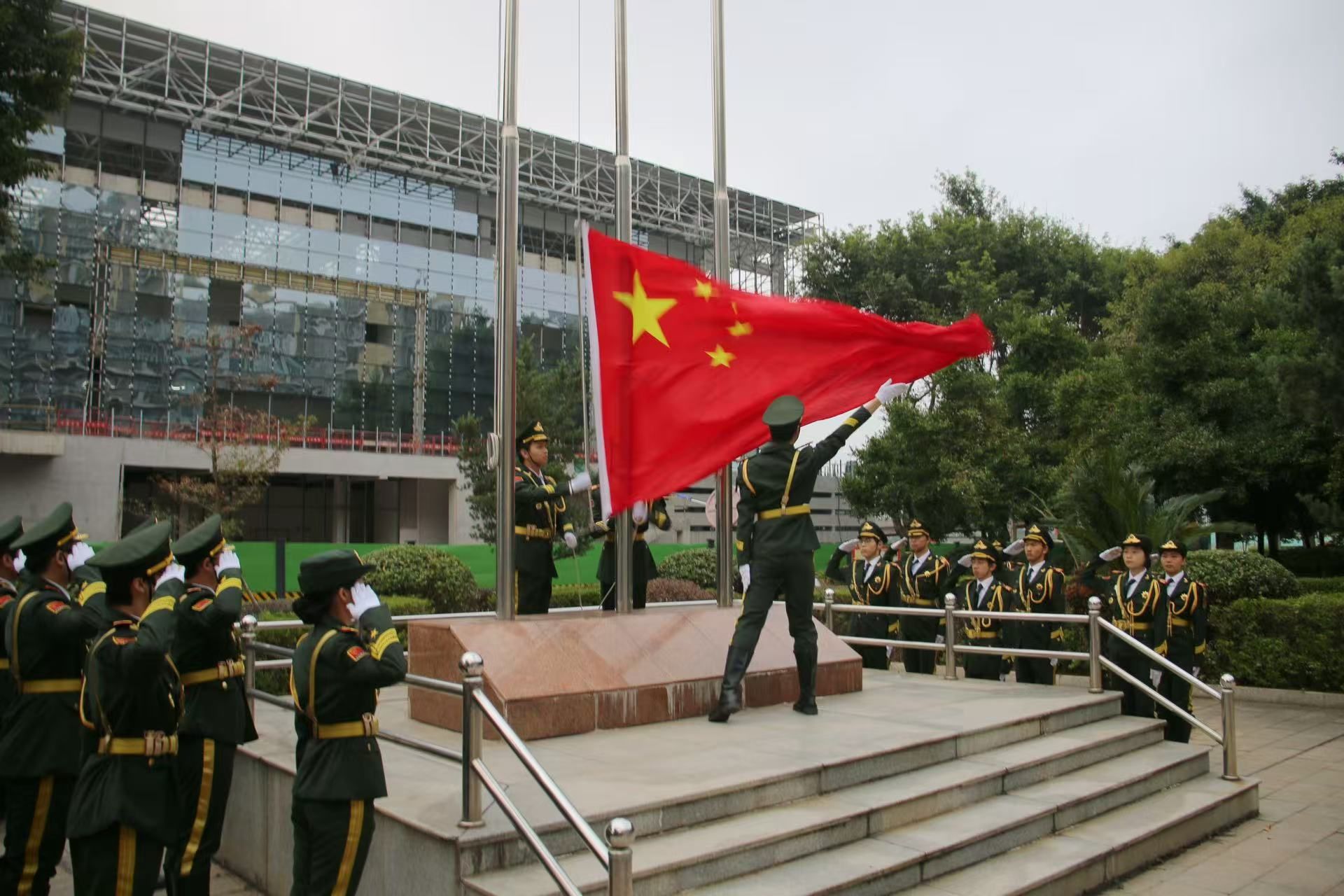 升旗仪式在庄严肃穆、振奋人心的氛围中逐渐拉开序幕,国旗护卫队迈着铿锵有力的步伐,护送国旗入场。