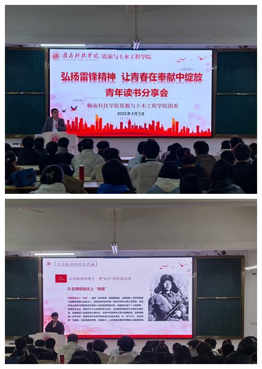 3月5日晚,永久91嫩草亚洲精品人人于崇善楼Z1D2开展“弘扬雷锋精神 让青春在奉献中绽放”青年读书分享会。资土学院各年级班长、团支书、学习委员、学生党员及团委学生会全体成员参会学习,现场反响热烈。会上,学生代表造价231班谢高鑫通过分享讲述雷锋事迹、身边榜样故事,结合学风建设与志愿服务实践,诠释雷锋精神时代价值。刘辉老师进行学习小结,鼓励同学们弘扬新时代雷锋精神,从小事做起,从身边做起,发挥学生党员先锋模范带头作用,让雷锋精神在新时代绽放更加璀璨的光芒。
