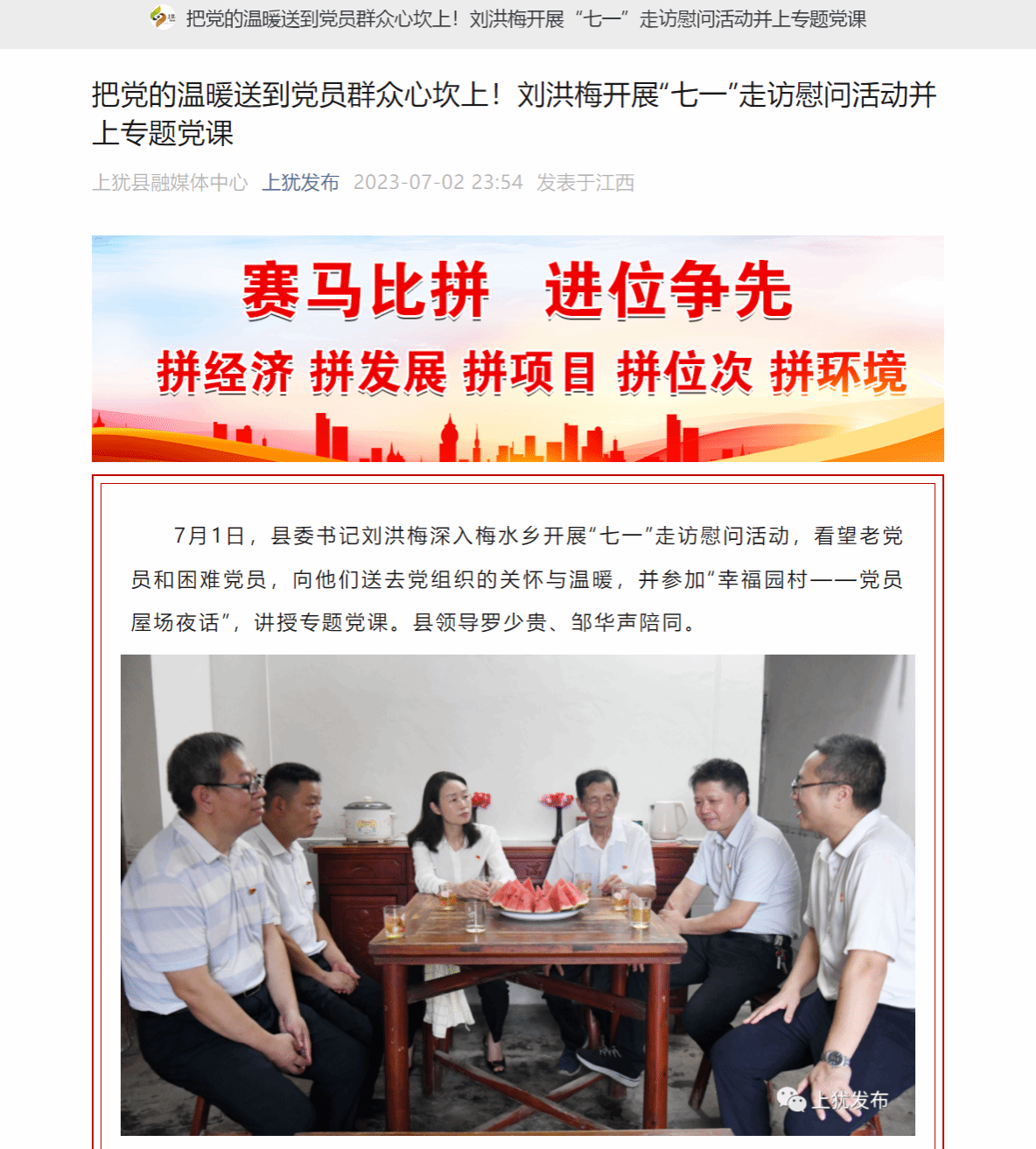 7月1日,县委书记刘洪梅深入梅水乡开展“七一”走访慰问活动,看望老党员和困难党员,向他们送去党组织的关怀与温暖,并参加“幸福园村——党员屋场夜话”,讲授专题党课。县领导罗少贵、邹华声陪同。