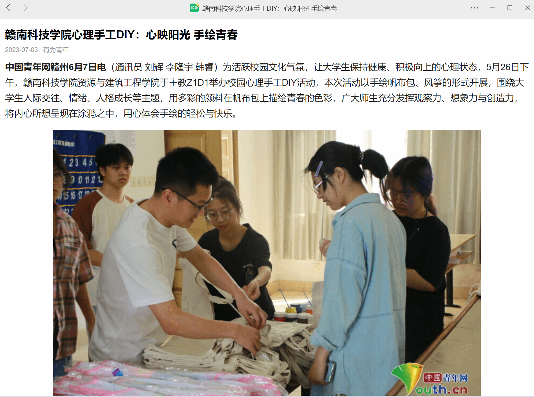 中国青年网赣州6月7日电(通讯员 刘辉 李隆宇 韩睿)为活跃校园文化气氛,让大学生保持健康、积极向上的心理状态,5月26日下午,赣南科技学院资源与建筑工程学院于主教Z1D1举办校园心理手工DIY活动,本次活动以手绘帆布包、风筝的形式开展,围绕大学生人际交往、情绪、人格成长等主题,用多彩的颜料在帆布包上描绘青春的色彩,广大师生充分发挥观察力、想象力与创造力,将内心所想呈现在涂鸦之中,用心体会手绘的轻松与快乐。