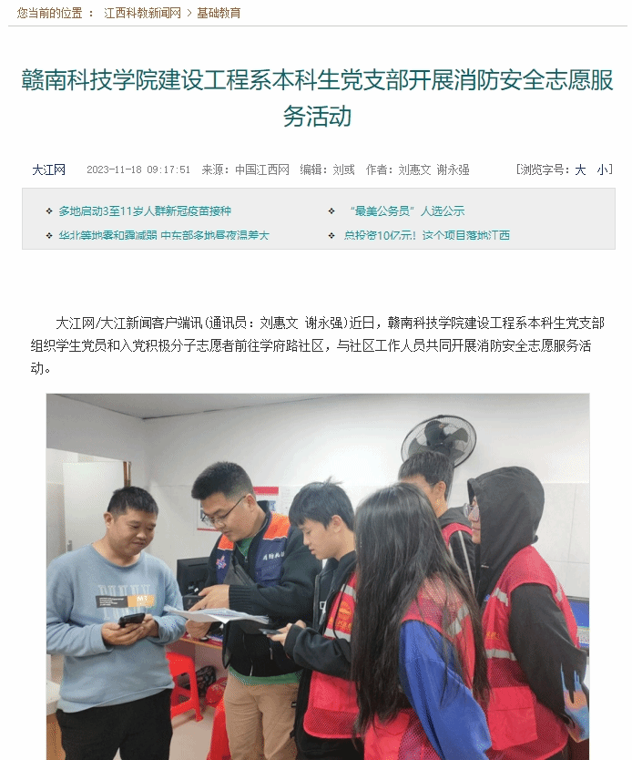 大江网/大江新闻客户端讯(通讯员:刘惠文 谢永强)近日,赣南科技学院建设工程系本科生党支部组织学生党员和入党积极分子志愿者前往学府路社区,与社区工作人员共同开展消防安全志愿服务活动。