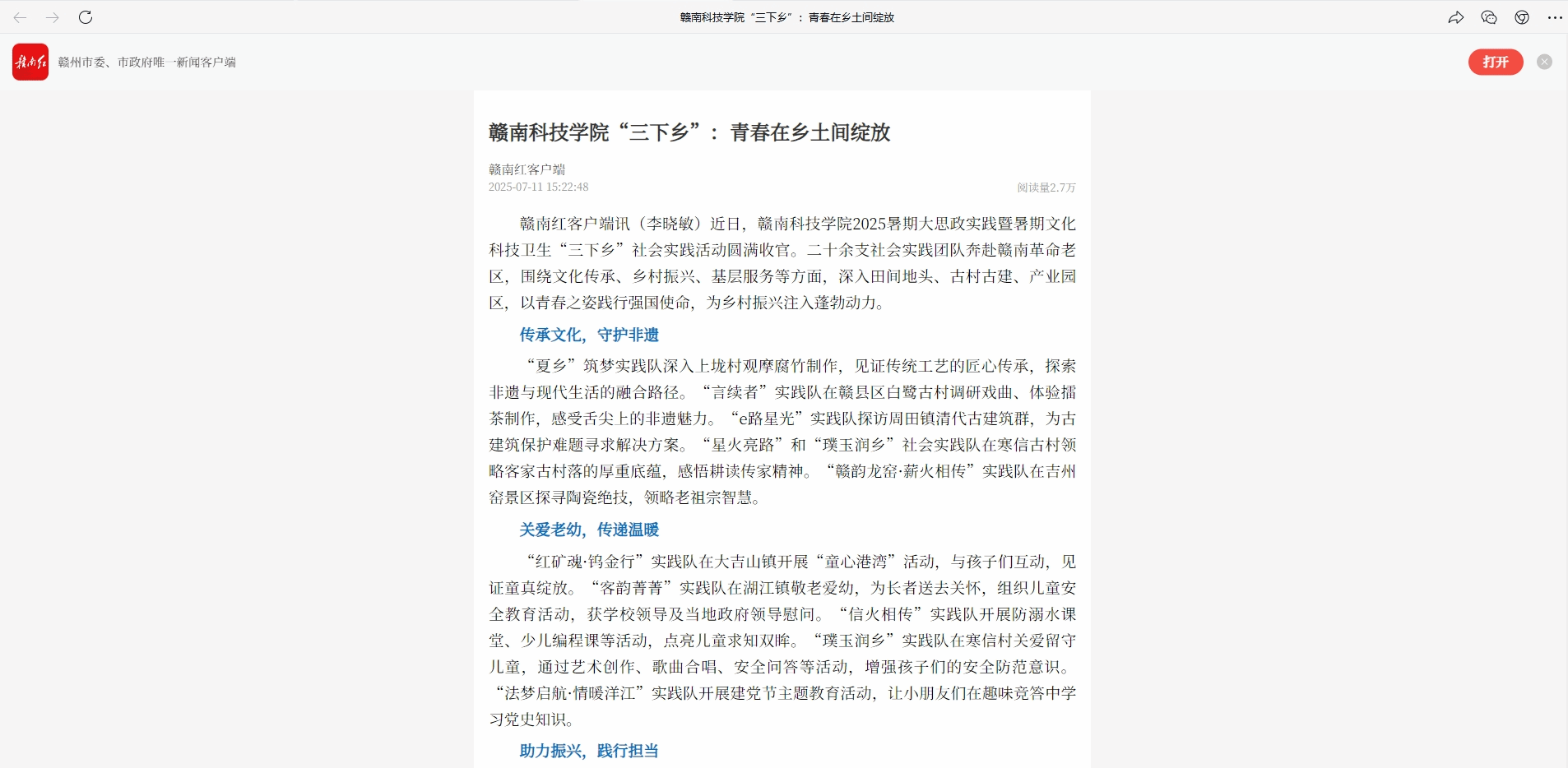 赣南红客户端讯(李晓敏)近日,赣南科技学院2025暑期大思政实践暨暑期文化科技卫生“三下乡”社会实践活动圆满收官。二十余支社会实践团队奔赴赣南革命老区,围绕文化传承、乡村振兴、基层服务等方面,深入田间地头、古村古建、产业园区,以青春之姿践行强国使命,为乡村振兴注入蓬勃动力。