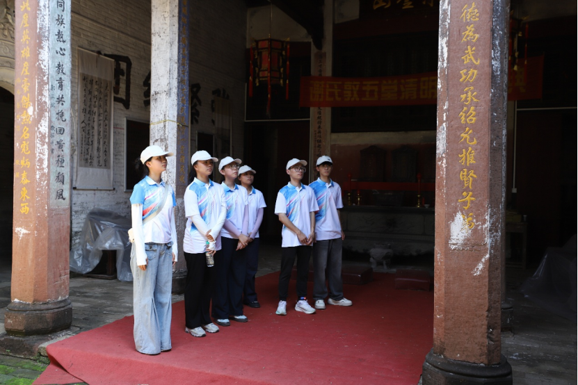 夏浒古村,既是客家人水上南迁的首站,也是抗倭名将戚继光的祖籍地。“客韵菁菁”实践队跟随夏浒村驻村第一书记查亚平的讲解,走进戚氏宗祠。宗祠内,“捍家卫国”四个鎏金大字悬于门楣,刚劲有力。队员们一进门,便被扑面而来的厚重气息包裹。18根红沙岩石柱撑起厅堂,柱上镌刻的楹联字字千钧:“忠孝为纲,处世当怀报国志”、“宗功继世,千秋家国系心头”……这些历经百年的文字,将“家”与“国”紧紧绑在一起,引得队员们驻足沉思,久久不愿离去。