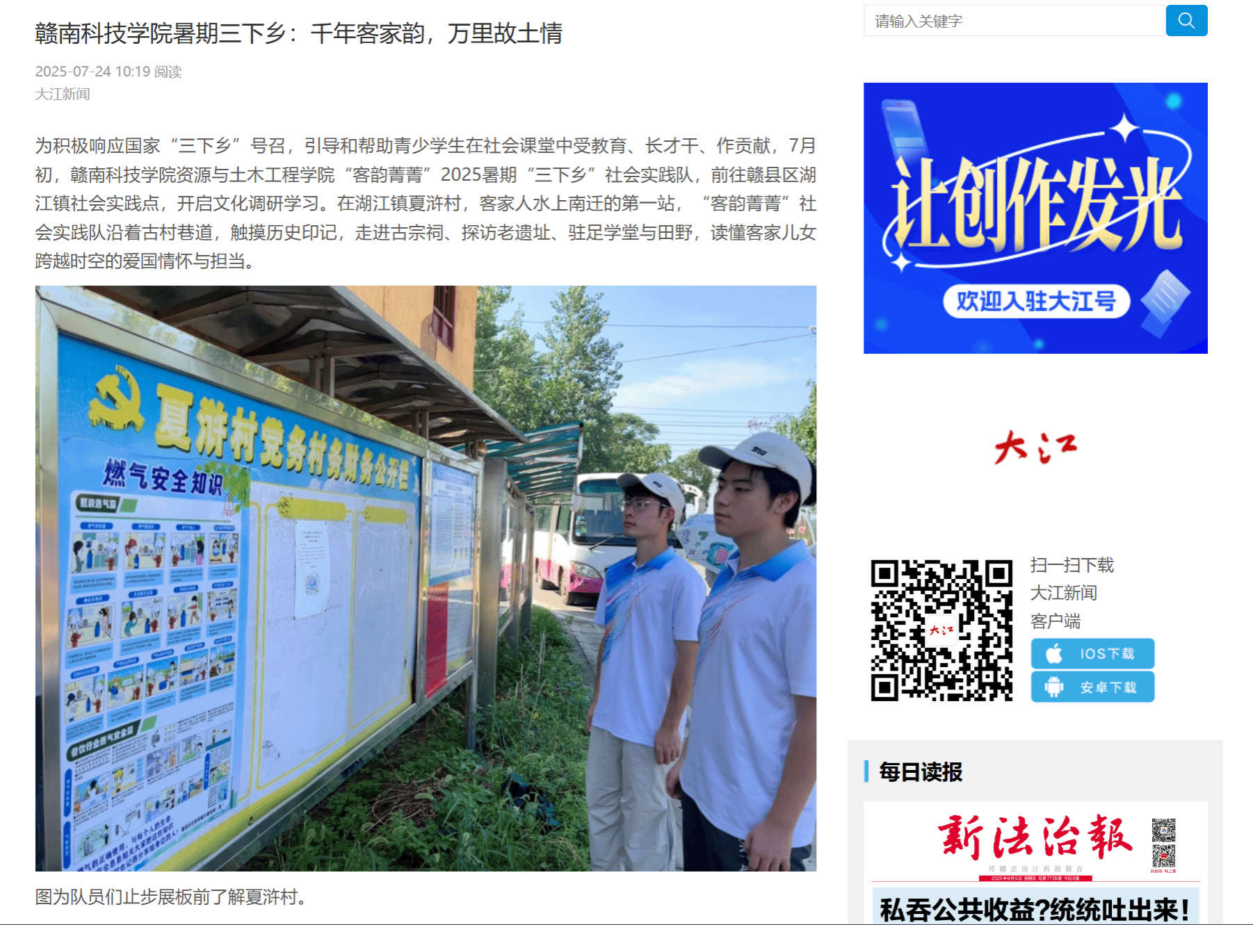 为积极响应国家“三下乡”号召,引导和帮助青少学生在社会课堂中受教育、长才干、作贡献,7月初,赣南科技学院永久91嫩草亚洲精品人人“客韵菁菁”2025暑期“三下乡”社会实践队,前往赣县区湖江镇社会实践点,开启文化调研学习。在湖江镇夏浒村,客家人水上南迁的第一站,“客韵菁菁”社会实践队沿着古村巷道,触摸历史印记,走进古宗祠、探访老遗址、驻足学堂与田野,读懂客家儿女跨越时空的爱国情怀与担当。